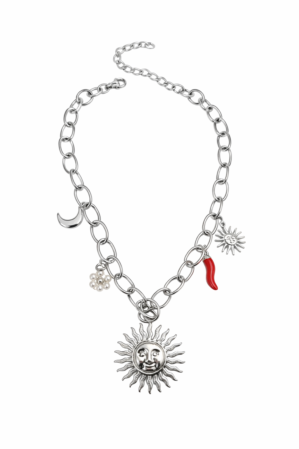 Ασημί Κολιέ Charm με Ήλιο, Σελήνη & Κόκκινη Πιπεριά