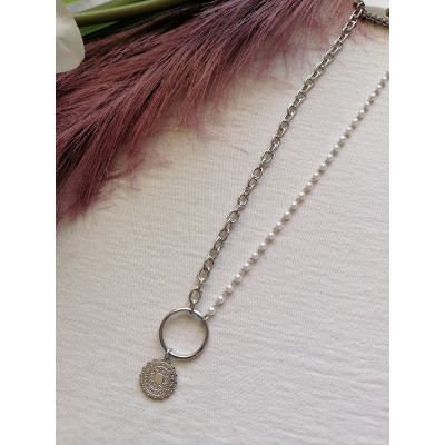 Κολιέ ασημί απο ανοξείδωτο ατσάλι.Συνδυασμός ροζάριο με πέρλα και χοντρή αλυσίδα.Δεν μαυρίζει και δεν προκαλεί αλλεργίες...