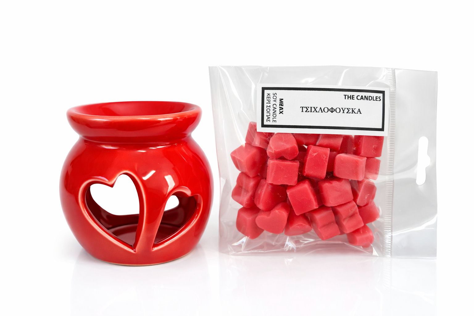 Ο κεραμικός καυστήρας σε σχήμα καρδιάς δημιουργεί ζεστή ατμόσφαιρα, ενώ τα κόκκινα wax melts από κερί σόγιας απελευθερώνουν υπέροχο άρωμα τσιχλόφουσκας, γεμίζοντας τον χώρο με γλυκές και ευχάριστες νότες.